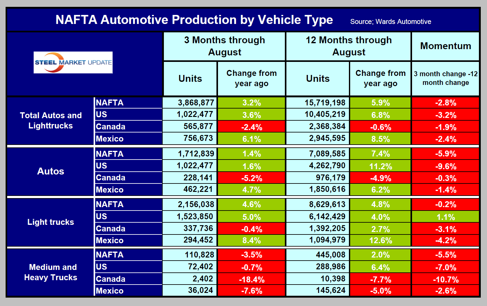 In 12 months through August year / year, US total light vehicle production was up by 6.8 percent, Mexico up by 8.5 percent and Canada down by 0.6 percent. There has been a change in product mix between the US and Mexico with US growth favoring autos as Mexico has favored light trucks (Table 1). Canada had negative growth in autos but eked out a small gain in light trucks. The trend reported previously by SMU in which the automotive companies are downplaying Canadian production continued through August.