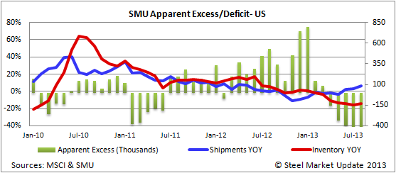 Based on SMU calculations the Apparent Deficit shrank by 3,000 tons compared to last month and now stands at 463,000 tons. The June deficit was 397,000 tons. In August 2012 there was an Apparent Excess of 529,000 tons. This means there has been an inventory adjustment over the past 12 months of 992,000 tons.