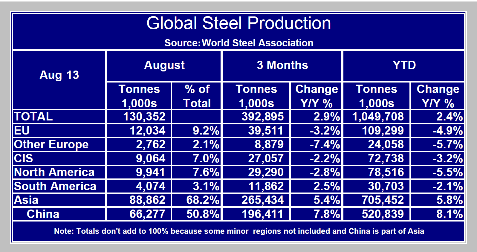 In August China’s steel production exceeded 50 percent of the global total for what we believe to be the first time. Global production in August was 130.352 million tonnes with a capacity utilization of 76.0 percent. In three months through August production was at an annual rate of 1.572 billion tonnes with a capacity utilization of 76.3 percent.