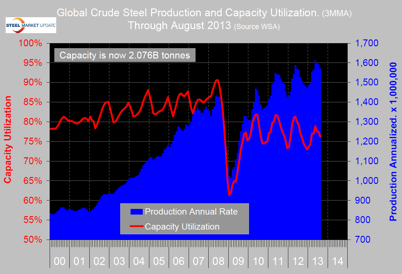 In August China’s steel production exceeded 50 percent of the global total for what we believe to be the first time. Global production in August was 130.352 million tonnes with a capacity utilization of 76.0 percent. In three months through August production was at an annual rate of 1.572 billion tonnes with a capacity utilization of 76.3 percent.
