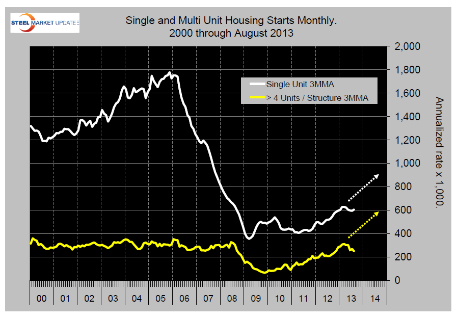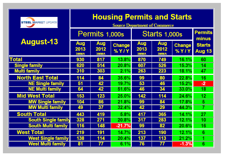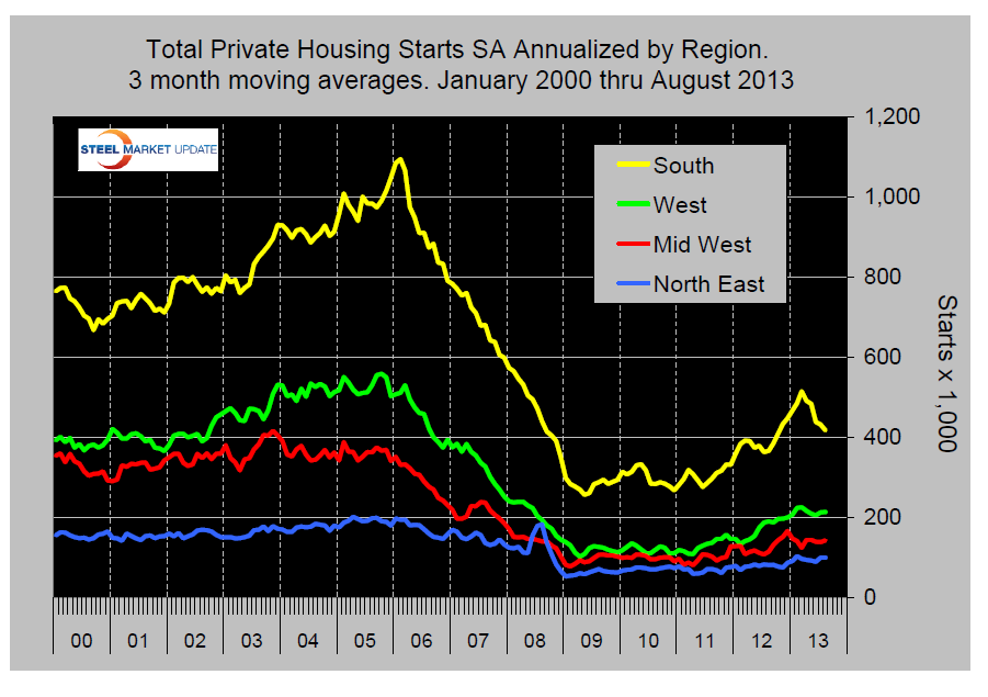 Starts for single family homes rose 7 percent offsetting a drop of 9.4 percent for multi-family units. Starts for single family homes dropped in all regions except the South which gained 12 percent from July’s revised rate. Starts were up 19 percent from August 2012.