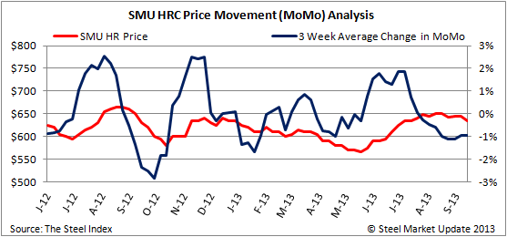 The change in MoMo can be a useful indicator in depicting the severity of price movements. Looking at this change on a 3-week moving average, we see that the trend in HRC price movement fluctuation has begun to flatten out over the past 3 weeks. The 3-week average change in MoMo is -0.96 percent, a slight increase for the 3rd week in a row after 10 weeks of consecutive declines. The graph below demonstrates the relationship between the SMU hot rolled coil price and the three week moving average change in MoMo. Our HRC price range for this week is unchanged at $620- $650/ton with an average price of $635/ton.