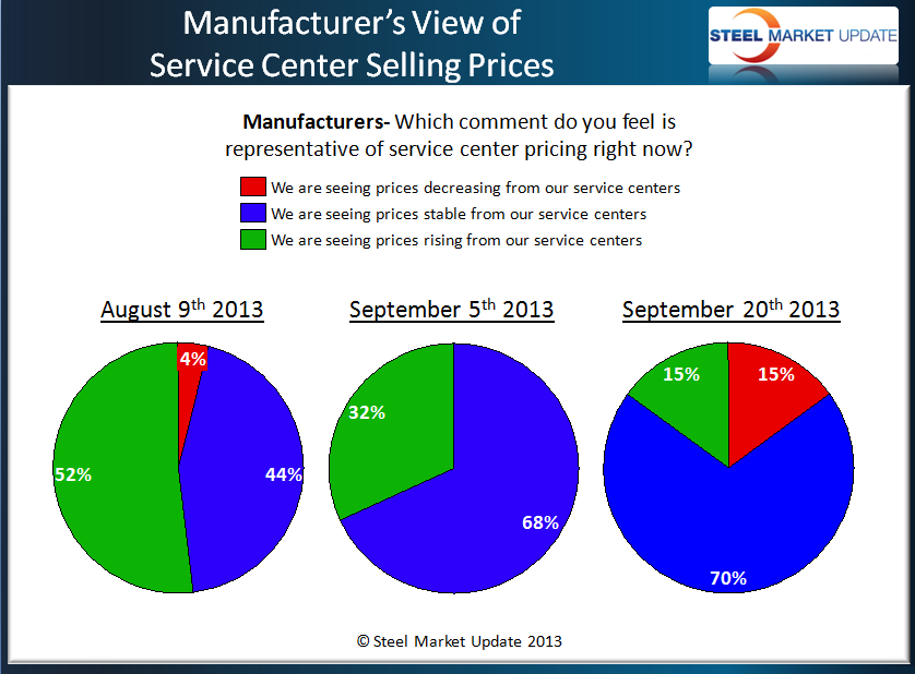During last week’s steel market review conducted by Steel Market Update (SMU), manufacturing companies reported seeing as many service centers lowering prices as those attempting to increase spot prices (see graphic). At the beginning of August a majority of manufacturing companies reported their service center buyers raising spot prices. Since then, the percentage shrank to 32 percent at the beginning of September and is now at 15 percent. The majority of manufacturing companies are reporting spot prices as being stable. By the way, the thumbnail graphics are “clickable” which will blow up the size for you to be able to read them better