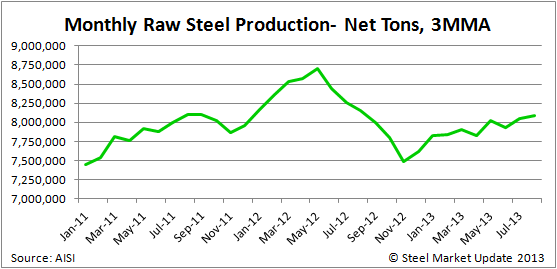 The American Iron & Steel Institute (AISI) reported their final raw steel production numbers for the month of August 2013. This estimation is different than the weekly raw steel production as it is based on 75 percent of the domestic mills reporting vs. 50 percent for the weekly estimates.