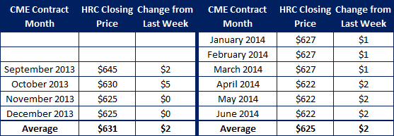 The ever stricter lending conditions by China’s banks are a likely culprit of that correction as it starts to pinch the production channel more firmly. So goes rebar, so goes Iron Ore, so goes world ferrous values. Unfortunately China’s production at over half the world’s capacity is just too big to ignore over time. Everyone appears to be waiting for September’s economic numbers there hoping that an upward trend may be developing to avoid such a correction.In the meantime, let’s call Oct ’13 either side of $130.50/MT, Q4 ’13 either side of $127.5/MT, Q1 ’14 either side of $124.50/MT, and Cal ’14 either side of $116.00/MT.