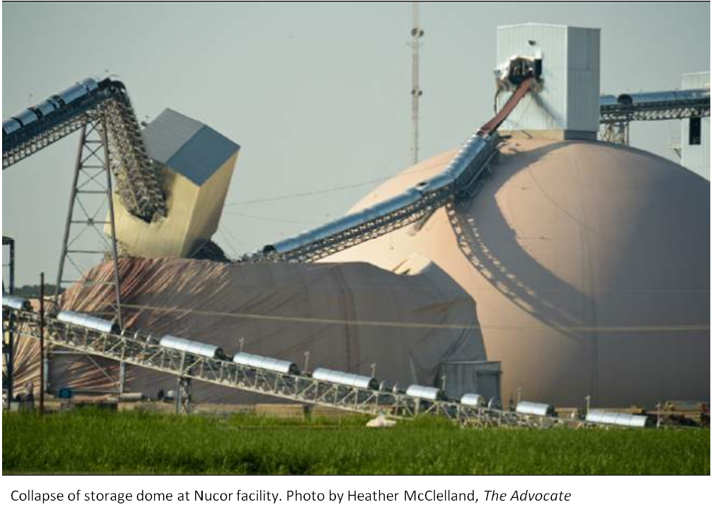 On Wednesday afternoon, one of three storage domes for storage of iron ore pellets, suffered structural failure and collapsed, creating what sounded like an explosion and prompting calls to 911. No explosion, fire or injuries occurred. The dome, which is constructed of concrete with a fabric skin, was reported to look a deflated balloon. The conveyor system connected to the tops of the three domes was bent. The collapse is under investigation said Nucor officials.