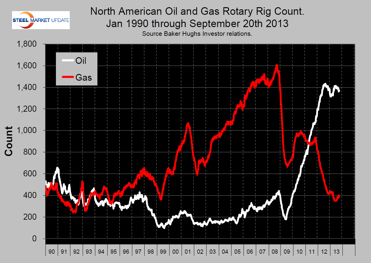 The Baker Hughes North American Rotary Rig Count is a weekly census of the number of drilling rigs actively exploring for or developing oil or natural gas in the United States and Canada. Rigs are considered active from the time they break ground until the time they reach their target depth and may be establishing a new well or sidetracking an existing one. The Baker Hughes Rotary Rig count includes only those rigs that are significant consumers of oilfield services and supplies. The number of rigs operating has a significant impact on the steel market especially for hot rolled coils.