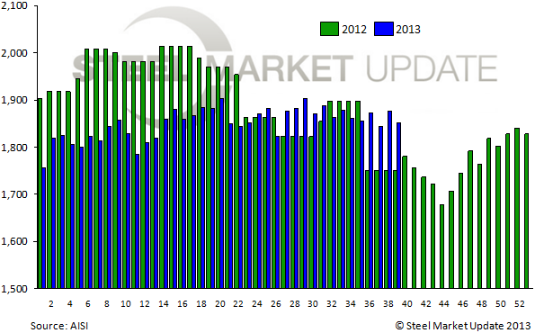 For the week ending September 28, 2013, the American Iron & Steel Institute (AISI) reported that the U.S. steel industry produced 1,852,000 net tons of raw steel, a 1.3 percent decrease over the previous week but a 5.8 increase over the same week one year ago. The estimated capacity utilization rate is 77.3 percent, down from 78.3 percent last week but up from 70.4 percent last year.