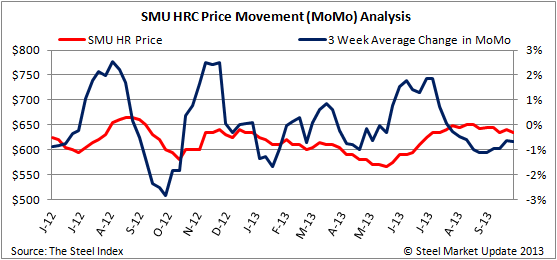 The change in MoMo can be a useful indicator in depicting the severity of price movements. Looking at this change on a 3-week moving average, we see that trend in HRC price fluctuation has begun flatten out over the past 4 or 5 weeks. The 3-week average change in MoMo is -0.69 percent, a slight decrease after 4 weeks of consecutive increases, but nothing substantial. The graph below demonstrates the relationship between the SMU hot rolled coil price and the three week moving average change in MoMo. Our HRC price range for this week is up slight to $620- $650/ton with an average price of $635/ton.