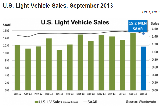 Analysts say the September decline is nothing to worry about. Forecasts for the fourth quarter are optimistic with final sales expected at 15.6 million units for the year. The federal shutdown is not expected to impact auto sales for October.