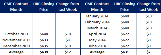 November and December values are approaching $640, Q1 close to $645 and cal 14 to $630. This renewed optimism might need to be taken with a grain of salt as demand follow through has yet to really come back into the market in full force. As tends to happen with futures market, prices have seemingly over shot a bit to the upside as those in the physical market remain cautious prices are set to appreciate very much higher from here. Time will tell, busheling is trading sideways and other raw materials are flat.