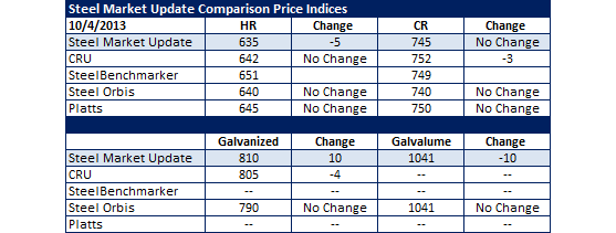 The various steel indices followed by Steel Market Update showed very little change in their pricing assessments of flat rolled steel coils. Most of the indexes saw prices as moving sideways as we wait for buyers to digest the latest offerings from the domestic steel mills. In the case of Steel Market Update we collected a slightly wider range in hot rolled ($620-$650) this week which brought our number down $5 per ton but, over the past six weeks pricing has barely budged.