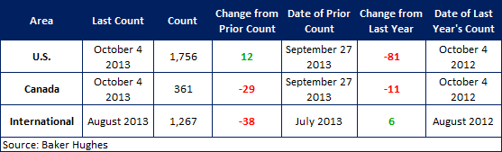 According to Baker Hughes data from October 4th, 2013, the U.S rig count for this week is 1,756 rigs exploring for or developing oil or natural gas. This count is an increase of 12 rigs when compared to last week, with oil rigs up 10 to 1,372 rigs, gas rigs up 2 to 378 rigs, and miscellaneous rigs unchanged at 6 rigs. Compared to last year the 1,756 count is a decrease of 81 rigs, with oil rigs down by 26, gas rigs down by 59, and miscellaneous rigs up by 4.