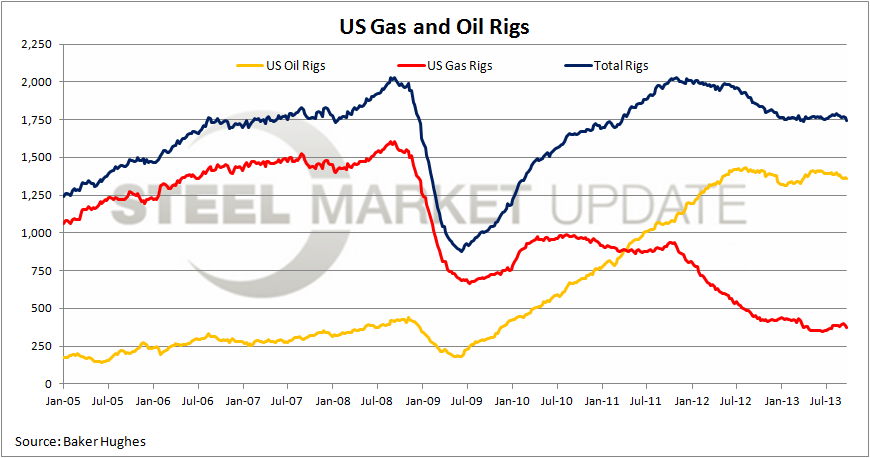 According to Baker Hughes data from October 4th, 2013, the U.S rig count for this week is 1,756 rigs exploring for or developing oil or natural gas. This count is an increase of 12 rigs when compared to last week, with oil rigs up 10 to 1,372 rigs, gas rigs up 2 to 378 rigs, and miscellaneous rigs unchanged at 6 rigs. Compared to last year the 1,756 count is a decrease of 81 rigs, with oil rigs down by 26, gas rigs down by 59, and miscellaneous rigs up by 4.
