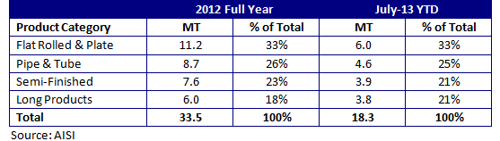 Pipe & tube requires some special analysis. In 2012, pipe & tube imports were 5.6 MT welded and 3.1 MT seamless. One could argue that welded products should be allocated to flat rolled and seamless products should be allocated to long products. If you make this adjustment, flat rolled imports would increase to 16.8 MT (50% of the total) and long products would increase to 9.1 MT (27% of the total).