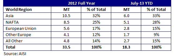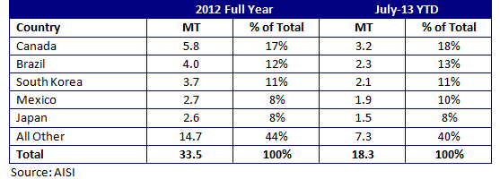 As shown, five countries are 55% – 60% of total imports. Although Brazil is second on the list, a significant portion of Brazilian imports are slabs for the ThyssenKrupp facility in Alabama. China is noticeably absent from the list. In 2012, China imported 1.7 MT to the U.S. representing 5% of total imports. (By Paul Lowrey – Managing Director of Steel Research Associates, LLC)