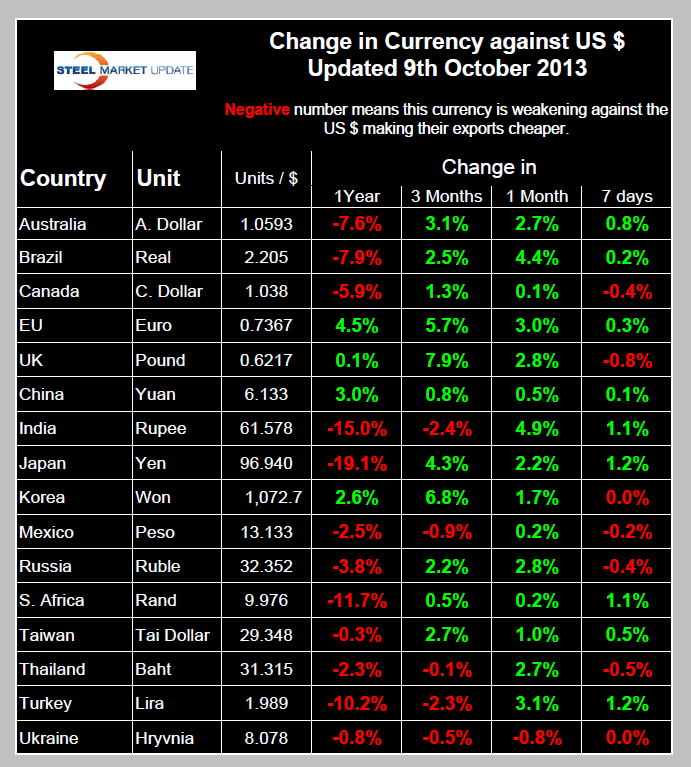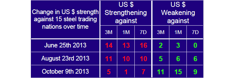 Steel Market Update first began our currency analysis in June and it became immediately apparent when we looked at October that there had been an enormous shift in these 16 currencies that was not being picked up by the broad index. In order to try to visualize this shift in a macro way we have developed Table 2 for the first time this month. Comparing the change in currency values in the one month before the June report with the one month before this October report shows that in June the US $ strengthened against 13 of the 16 currencies, in October it weakened against 15 of the 16. This means that the US is less desirable as an export destination and that this factor will tend to depress imports and support exports thus moving net steel trade in a positive direction.