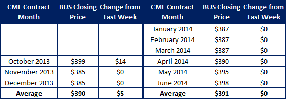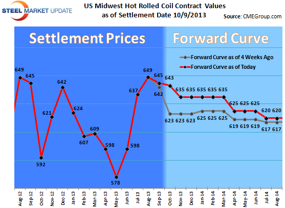 This has been a big week in Steel futures as price increases in the spot market have brought buyers and sellers to the table on futures. We have traded 170 contracts or 35,400 ST, all traded in the months of November and December! Wow look at that volume! Yeah! That might be a record. I will have to check. The prices haven’t changed much in the week as initial volumes were triggered by buyers coming in due to the price increase announcements (some short cover and some hedging buying basis Open Interest changes) and further volumes traded mid and end week when the CRU price didn’t move up $642 despite the price increases the week prior, and sellers came in and appeared to hit standing bids in the market. The range has been pretty much $635-640/ST on the nearbys with slightly lower levels indicated for the Cal ’14 months, which was last offered $633/ST for size. Can anyone say “steel mill involvement”;
