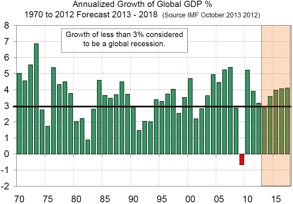 Last week the International Monetary Fund (IMF) revised its forecast for global / regional and national Gross Domestic Product (GDP) growth through 2018. For 2013 the projection for global growth was reduced by 0.3 percent to 2.9 percent and for 2014 was reduced down by 0.2 percent to 3.6 percent. As it stands 2013 will be the 3rd consecutive year of declining growth (Figure 1).