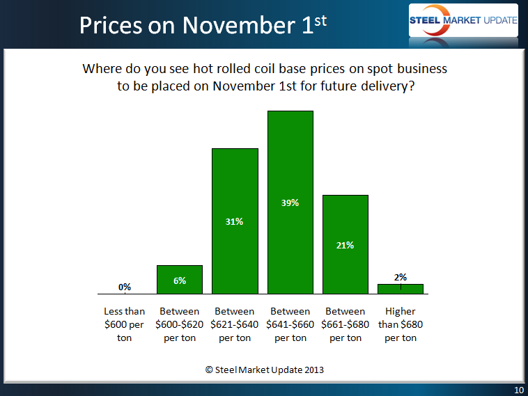 SMU also asked where our respondents feel spot prices will be once we reach November 1st. The numbers suggested by our respondents do not equal the $670-$680 per ton pricing being suggested by the domestic steel mills. One service center executive who is a respondent to our surveys spoke to SMU on this subject this afternoon. He indicated that the steel mills are “digging in their heels” and attempting to collect most of the increases. However, at the same time he told us, “I’m convinced every day that this party is going to come to an ugly end.” Maybe there is some of that thought process in the numbers captured during our survey which ended this afternoon.