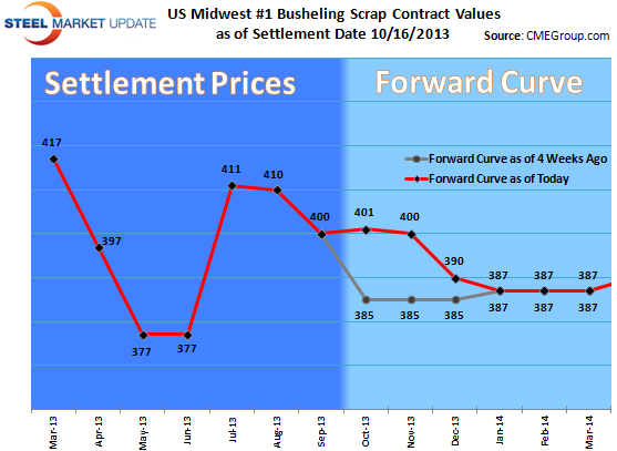Futures are quiet still, but interest has circulated of late on Nov/Dec, last $400/$415. In the spot world early indications are that scrap will rise, range estimates run from $10-20/GT. We’ll know more in two weeks about where mill orders are as buyers seem to hold their ground for now. CFR Turkey has remained stable having risen to $375/GT, the uptick from $367/GT level a couple weeks back due in part to currency fluctuations and some re-stocking going on into the winter season. No fireworks expected here however as demand in the MENA region still suffering and excess units from other shores continue to pressure margins.