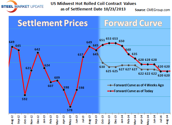 The recent strength in the physical market has sent futures prices up over the past month. This week, however, prices have begun to soften as most market participants feel the market has reached a top. Talk of revived imports coming in as well as some domestic mills offering deals a bit below published prices has given ammunition for sellers to start attacking bids down the curve. While so far a big move has not been made, weakness down the curve prevails. After peaking around $660 last week November and December futures periods have traded down to $653 today. The back end of the curve remains at a fairly steep discount to the spot with the calendar ‘14 value around $630 and Q1 trading around $645 and Q2 $625.