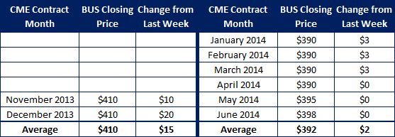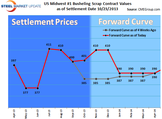 The busheling futures market has shot up this week as it is becoming more evident that Midwest prime will be up $30-40 this month. After settling at $385 per ton the November and December futures contracts have been bid as high as $420 in the market as traders look to lock in prices before next month’s jump in pricing. While volumes remain low, the talk of a big move in the physical market has brought out several new market participants looking to trade the busheling futures contract. Hopefully a continued increase in volatility will help to spark more trading on this contract as it moves past its first year anniversary.