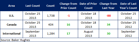 According to Baker Hughes data from October 25th, 2013, the U.S rig count for this week is 1,738 rigs exploring for or developing oil or natural gas. This count is a decrease of 1 rig when compared to last week, with oil rigs down 4 to 1,357 rigs, gas rigs up 4 to 376 rigs, and miscellaneous rigs down 1 to 5 rigs. Compared to last year the 1,738 count is a decrease of 88 rigs, with oil rigs down by 51, gas rigs down by 40, and miscellaneous rigs up by 3.