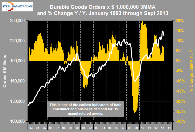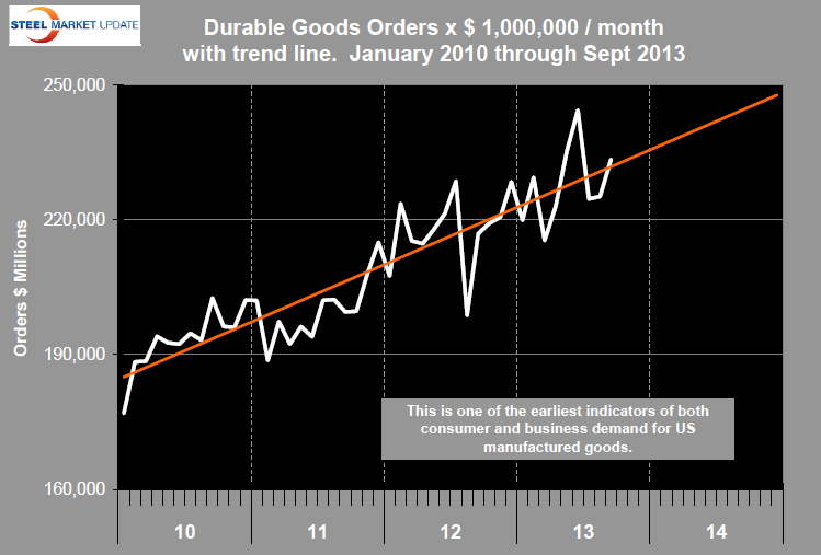 New orders for manufactured durable goods in September came in slightly above trend at $233.411 billion, (Fig 1). This monthly data is very spiky mainly due to erratic orders for civil aircraft. However it is one of the earliest indicators for US manufactured goods and though we are not involved in aviation the overall trend line is very relevant to the steel business.