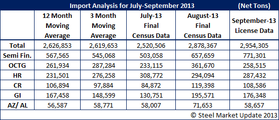 The U.S. Department of Commerce released final August import numbers late last week. August steel imports rose by 368,606 net tons to 2,878,367 net tons due to higher slab, OCTG, cold rolled and hot-dipped galvanized imports. Slab imports were up by 140,252 tons over the prior month to 657,659 tons total. However, this was expected as ThyssenKrupp Steel USA continues to build back their inventories. Brazil, which is where the ThyssenKrupp CSA slab mill is located, shipped 374,322 tons of slabs during August which was an increase of 74,802 tons above their July numbers. We also saw increases in slab shipments out of Russia and Mexico.