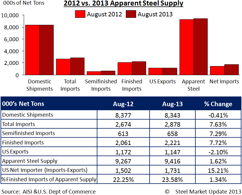 Apparent steel supply for August 2013 was up slightly compared to the same month one year ago by 1.62 percent. This is primarily due to higher total imports and higher semi-finished imports for this year. The net trade from imports and exports was a surplus of 1,730,960 net tons in August of this year, up from 1,502,420 NT in the prior year.