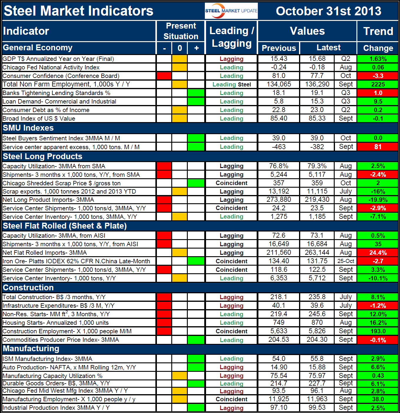 Explanation: The key indicators chart is designed to give a snapshot of the steel market on a specific date. The chart is stacked vertically to separate the primary indicators of the general economy, of proprietary Steel Market Update indices, of both flat rolled and long product market indicators and finally of construction and manufacturing indicators. The indicators are classified as leading, coincident or lagging as indicated.