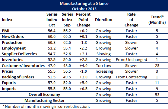 The ISM Manufacturing Index surprised economists with a PMI reading of 56.4 in October—the highest level in 2013. Expectations were for the index to fall to 55 this month but instead the PMI increased 0.2 percentage points from September’s reading of 56.2.