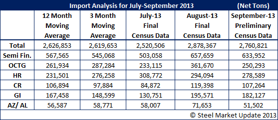 The U.S. Department of Commerce is trying to catch up on the steel import licensing data after being affected by the government shutdown orchestrated by our representatives in Washington, D.C. The US DOC released Preliminary Census Data for September imports late last week. Imports continue to be at a high level although slightly lower than what was seen during the month of August. The 2,760,821 net tons of steel imports were 117,546 tons less than the prior month with the largest percentage of the reduction coming from oil country tubular goods (OCTG) which dropped by 111,377 tons.