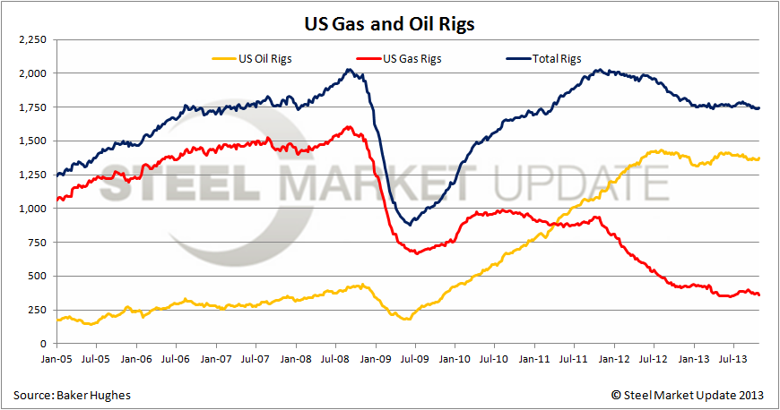According to Baker Hughes data from November 1st, 2013, the U.S rig count for this week is 1,742 rigs exploring for or developing oil or natural gas. This count is an increase of 4 rigs when compared to last week, with oil rigs up 19 to 1,376 rigs, gas rigs down 16 to 360 rigs, and miscellaneous rigs up 1 to 6 rigs. Compared to last year the 1,742 count is a decrease of 58 rigs, with oil rigs up by 3, gas rigs down by 64, and miscellaneous rigs up by 3.