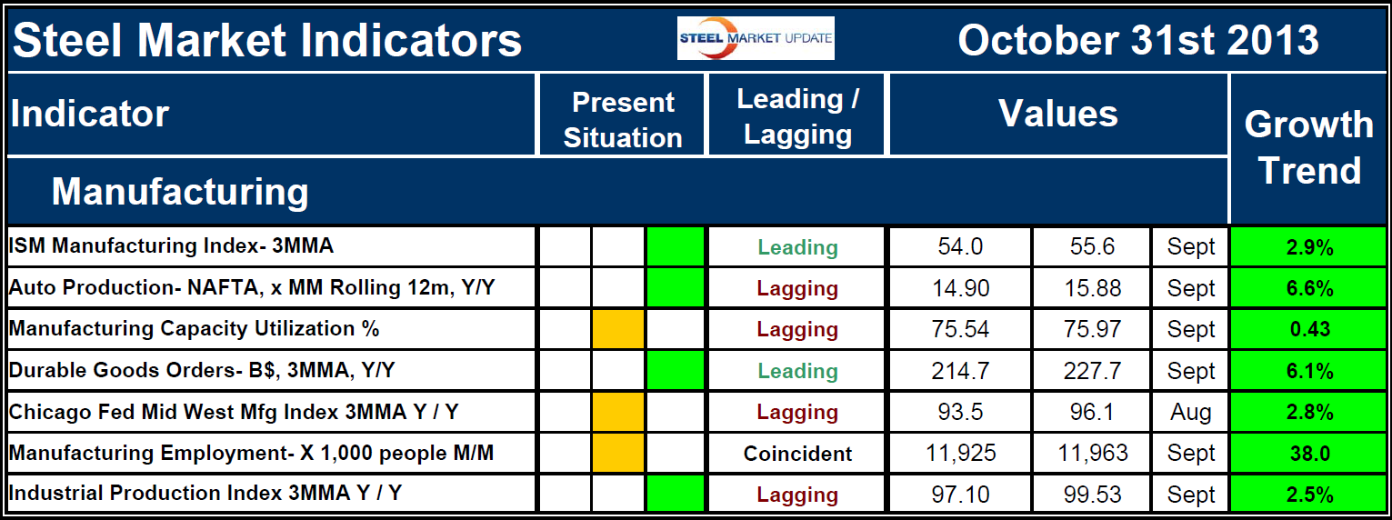 Each month the Steel Market Update publishes a table of what we believe to be the most significant indicators of the state of the steel market and current results in the long and flat rolled sectors. We will be discussing one section of this table in detail each month, beginning with manufacturing, Table 1. An explanation of the structure of this chart is given at the end of this piece for the benefit of those readers who are not familiar with it.