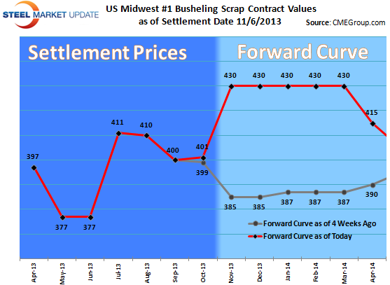 The busheling futures market continues to go from strength to strength this past week as prices have continued their upward trend. The Nov and Dec have been bid as high as $450 / ton last week before pulling back to around $430. Dec and March traded small volume yesterday at $430 per ton, registering the first cleared trade in months which hopefully is a sign of good things to come as volatility looks to re-enter the physical market. Indications are that the market will settle up at least $30 dollars to $430 in November and possibly up again in December . The continued strength in finished steel prices plus the historically strong winter periods for scrap pricing have coincided to push prices higher.