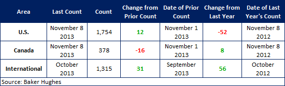 According to Baker Hughes data from November 8th, 2013, the U.S rig count for this week is 1,754 rigs exploring for or developing oil or natural gas. This count is an increase of 12 rigs when compared to last week, with oil rigs up 7 to 1,383 rigs, gas rigs up 5 to 365 rigs, and miscellaneous rigs unchanged at 6 rigs. Compared to last year the 1,754 count is a decrease of 52 rigs, with oil rigs down by 6, gas rigs down by 48, and miscellaneous rigs up by 2.
