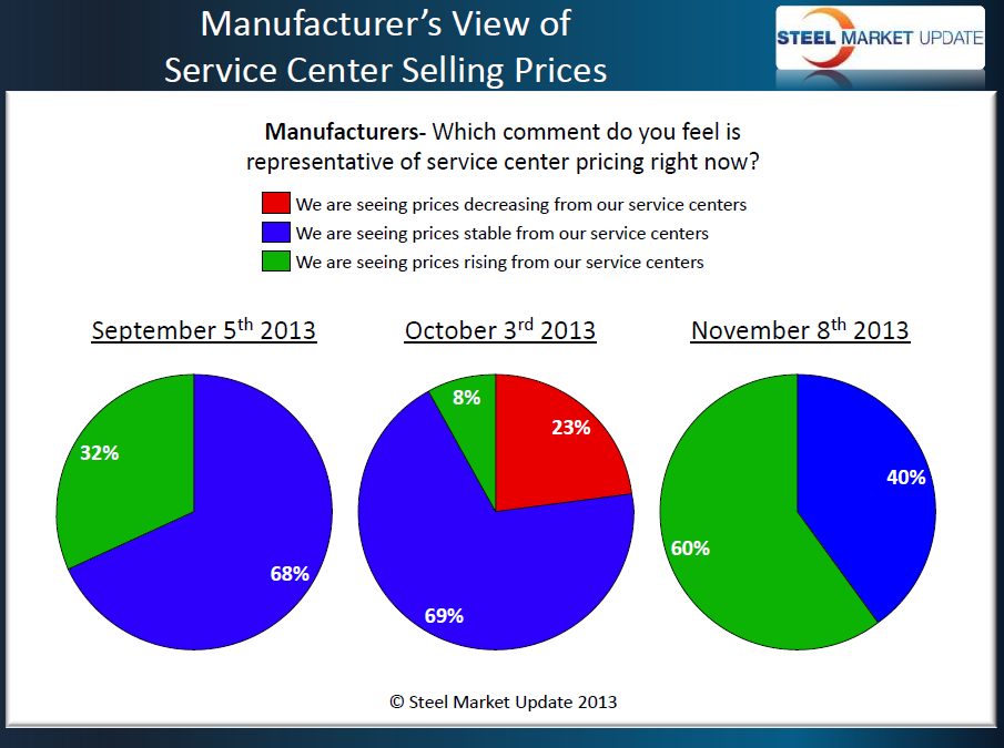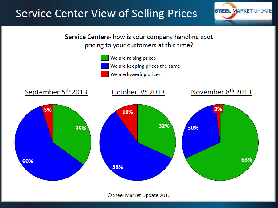 Based on responses from service centers the percentage of distributors reporting their company as raising prices as of the first week of November more than doubled since the first week of October (68 percent vs. 32 percent).