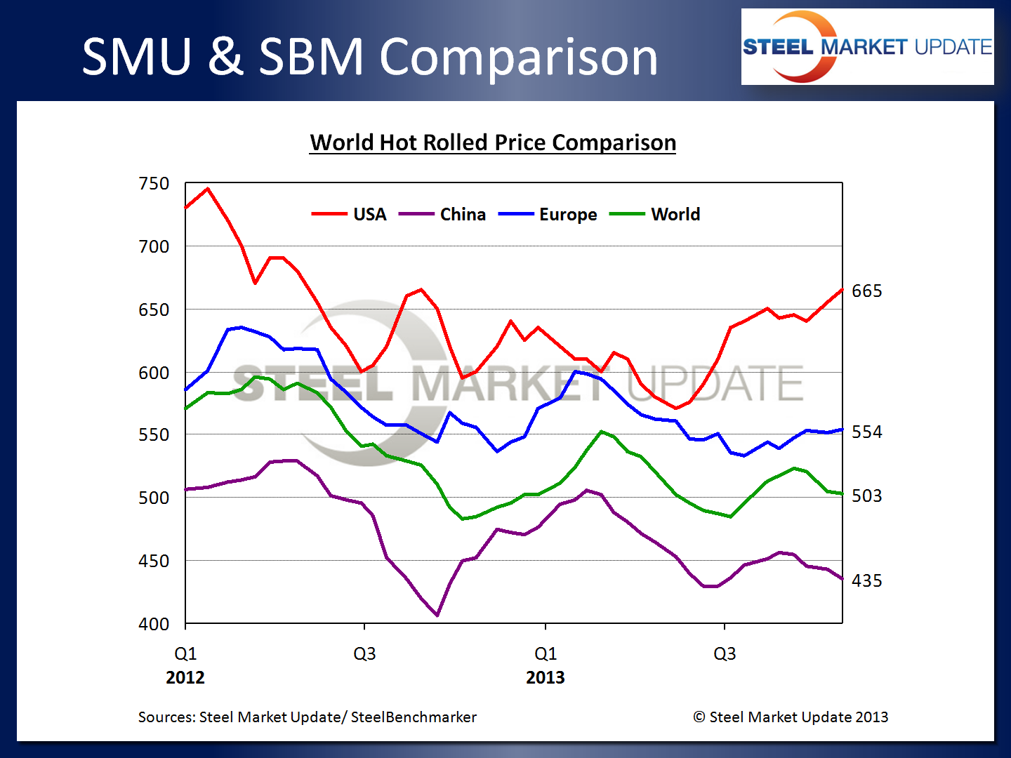The China and Europe numbers are EX Works (FOB producing mill) and are for domestic market consumption. The green line, which is the world export price as determined by SteelBenchmarker, is $503 per net ton to which one would need to add freight, insurance, handling and a trader’s margin. Based on SteelBenchmarker there was a $162 per ton spread between world export pricing and the SMU hot rolled average at the end of October (our current number is $660).