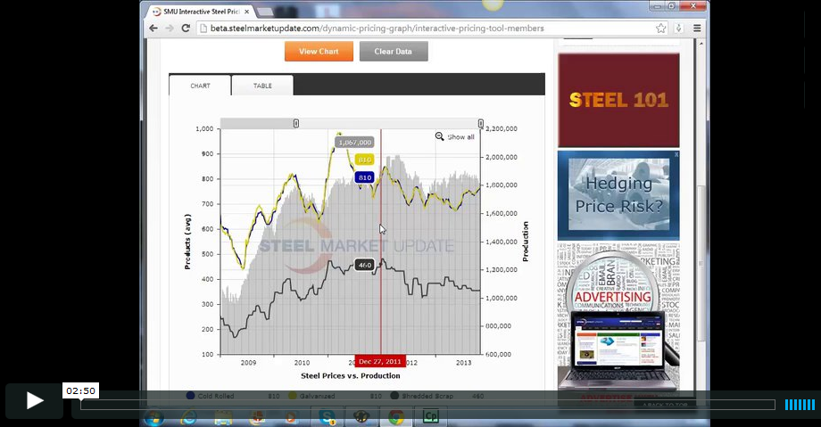 We wrote about our new “Interactive Graphing Tool” in an earlier issue, and we hope you had time to watch the demo video of it. Now we hope that you will take the time to actually play around with it and use in to your benefit. We are including the video tutorial again in this article. It is also found on the “Interactive Graphing Tool” page: http:// steelmarketupdate.com/dynamic-pricing-graph/interactive-pricing-tool-members. As we said before, this graphing tool is our “baby”. We felt our customers deserved better access to information – especially pricing information. So, we created our interactive graphing tool which is used in our steel and scrap pricing area as well as other areas of the website. It will give you the enhanced ability to manipulate various data sets, including all of all of our flat rolled steel and ferrous scrap prices. On the new website, you will be able to interact with pricing data all from a single graph. It is as easy as clicking your mouse a few times.