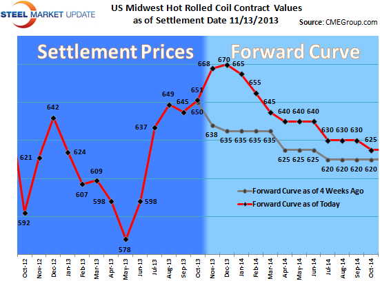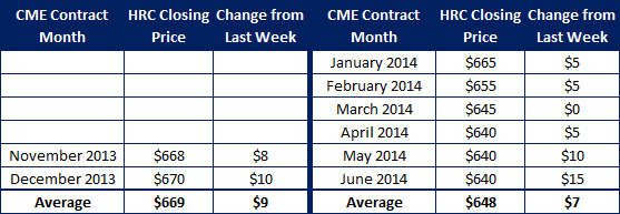 We had a decent week in futures with 950 lots or 19000 ST trading. A bit of a seesaw as the market is pushed to higher prices when someone has to come in and buy forward, and the next day is pushed to lower prices when someone has to come in and sell, etc. I don’t think the market has really changed a whole lot in the period except for the front two months. We are backwardated still with December either side of $665/ST, same as spot, coming off down to $630/ST area by the 4th quarter of 2014. We’ve seen a smattering of trades all the way down the curve this week with some Cal ’14 going through today.