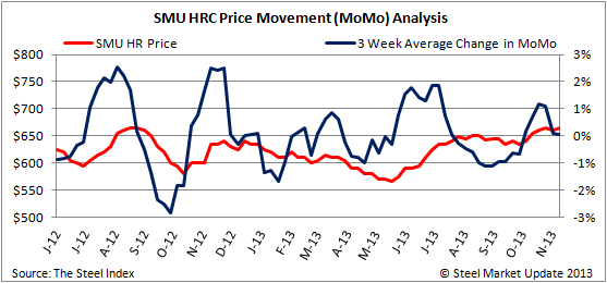 The graph below demonstrates the relationship between the SMU hot rolled coil price and the three week moving average change in MoMo. Our HRC price range for this week is $650-$680/ton with an average price of $665/ton.