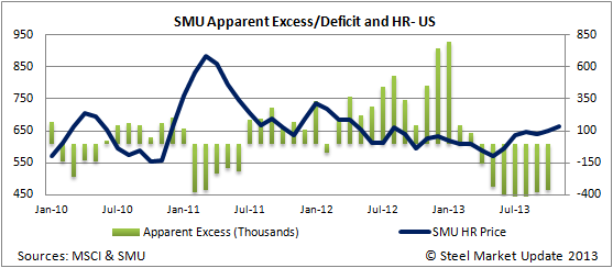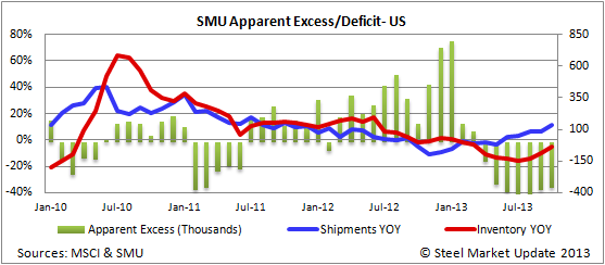 Based on Steel Market Update proprietary analysis of the recently released MSCI shipment and inventory data, we have determined that the Apparent Deficit of flat rolled steel for October now totals 361,000 tons. This is a reduction of 21,000 tons compared to the end of September. At the end of October 2012, service centers had a 142,000 ton excess.