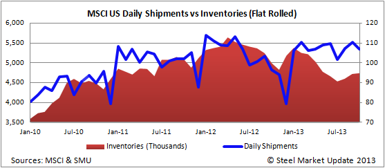 The Metal Service Center Institute (MSCI) released their service center shipment and inventory data for the month of October 2013. Total steel shipments (all products) were reported to be 3,791,600 tons. October, which had 23 shipping days compared to September with 20 days, had a daily shipping rate of 164,900 tons down from September’s 169,000 tons per day. The October 2013 daily shipment rate was 12,300 tons per day higher than that of one year ago (October 2012 also had 23 shipping days).