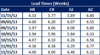 Lead times shrunk on three of the four flat rolled products followed by Steel Market Update. We saw hot rolled lead times fall back to 4.0 weeks from 4.36 weeks reported at the beginning of November.