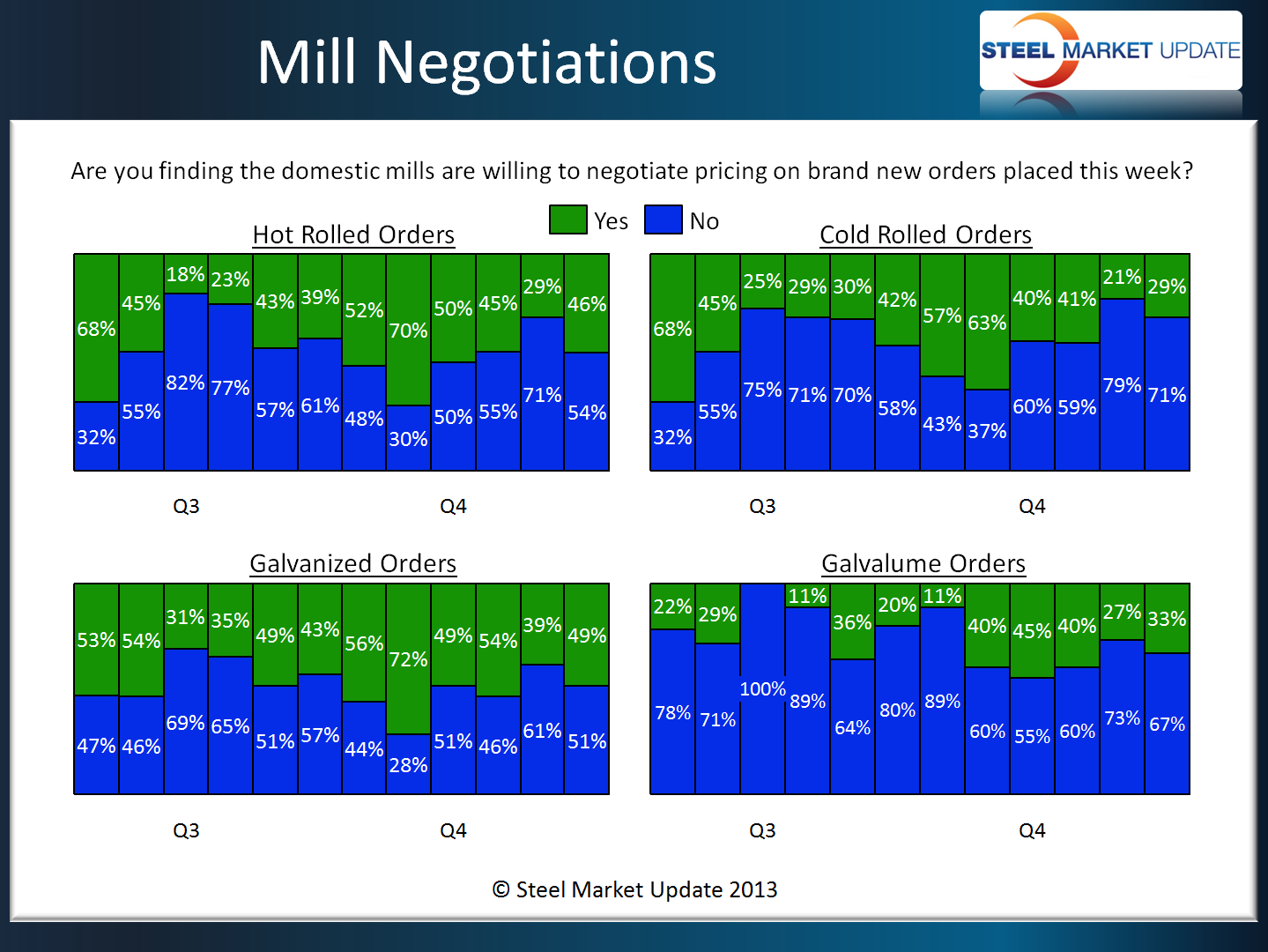 As lead times pulled back we saw a slight increase in the percentages of our respondents reporting the domestic mills as willing to negotiate pricing. Even with the increase the mills appear to be only mildly interested in negotiations with cold rolled and Galvalume being the two tightest products (least willing to negotiate) and hot rolled and galvanized being the most aggressive (most willing to negotiate).
