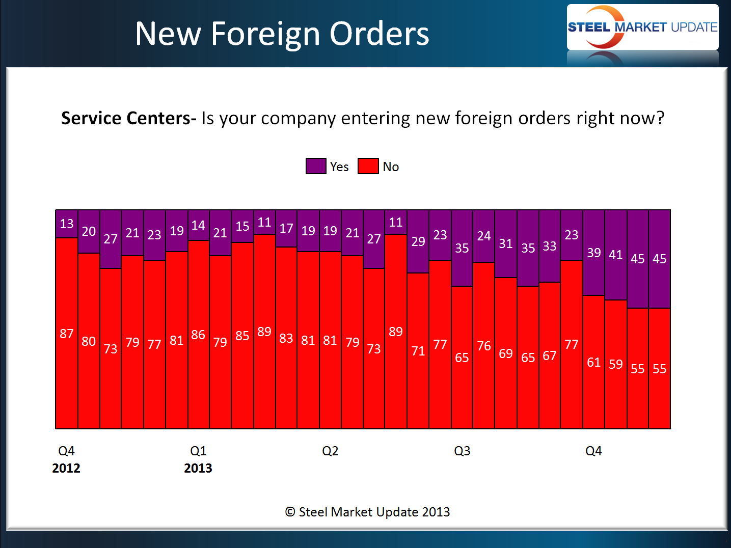 The service center data we have been collecting was even more dramatic than that of the manufacturers. We have seen a clear and growing trend toward placing foreign orders. During the 4th Quarter 2012 the percentage of distributors reporting to SMU that their company was placing foreign orders was 21 percent. The trend continued, with high teens to low 20’s percent levels being reported until we reached late second quarter 2013. From that point the percentages have been steadily increasing, with the last two surveys indicating 45 percent of the service centers reporting they were placing at least some tons in the foreign market.