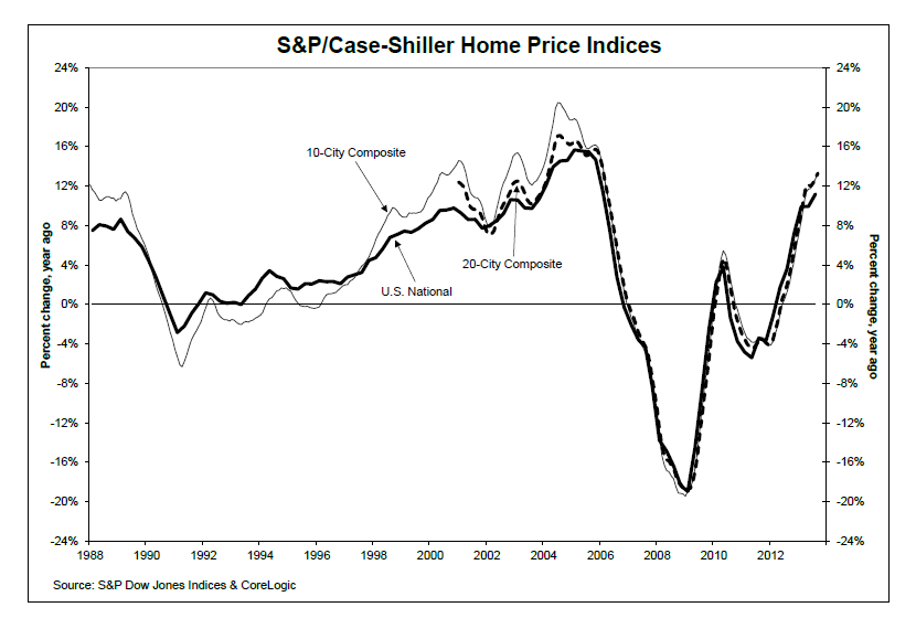 The S&P/Case Shiller U.S. National Home Price Index rose 11.2 percent year-over-year for its highest level since 2006, according to data compiled through September 2013. On a quarter-over-quarter basis, the third quarter index rose 3.2 percent.