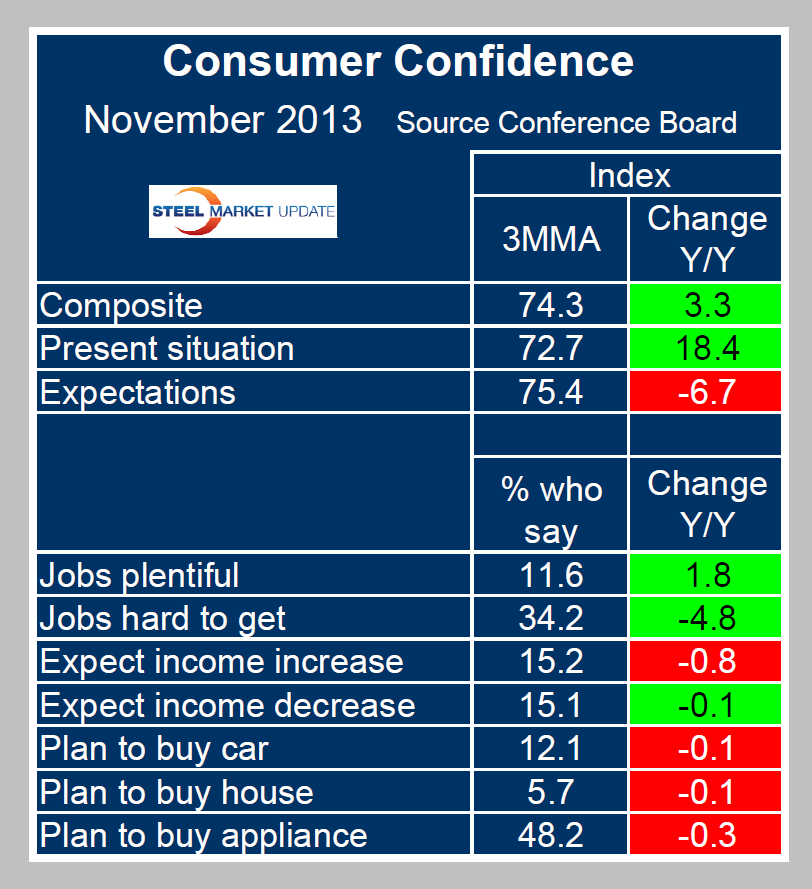 The Conference Board Consumer Confidence Index, which had decreased sharply in October, declined again in November. The Index now stands at 70.4 (1985=100), down from 72.4 in October. The Present Situation Index edged down to 72.0 from 72.6. The Expectations Index declined to 69.3 from 72.2 last month. The monthly Consumer Confidence Survey, based on a probability-design random sample, is conducted for The Conference Board by Nielsen, a leading global provider of information and analytics around what consumers buy and watch. The cutoff date for the preliminary results was November 15.
